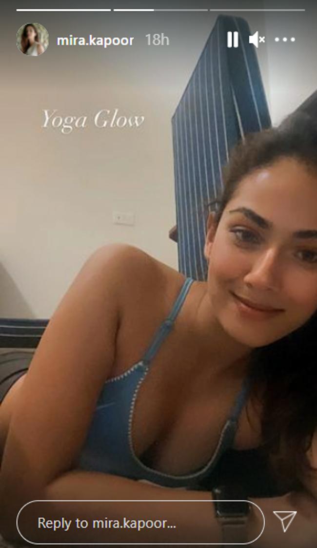 शाहिद कपूर की पत्नी मीरा राजपूत अपनी फिटनेस को लेकर बहुत सजग रहती हैं. शनिवार को मीरा ने घर पर एक वर्चुअल वर्कआउट सेशन किया. इस योग सेशन के बाद उन्होंने अपने चेहरे के निखार को फैंस के साथ साझा किया है. उन्होंने सेल्फी शेयर करते हुए उसपर कैप्शन में लिखा 'योग का निखार'.