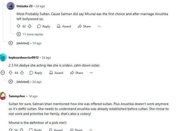 रेडिट पर मृणाल का ये वीडियो तेजी से वायरल हो रहा है. यूजर्स का मानना है मृणाल ने अनुष्का शर्मा पर अटैक किया है. यहां फिल्म सुल्तान की वो बात कर रही हैं. एक यूजर ने लिखा- ये महिला का अपमान है. दूसरों को नीचा दिखाकर खुद को ऊपर दिखाना शर्मनाक है. शख्स ने लिखा- अगर ये अनुष्का की बात कर रही हैं तो बेवकूफ हैं. यूजर्स ने मृणाल को मीन गर्ल का टैग दिया है. शख्स ने लिखा- अगर कोई आज इंडस्ट्री में काम नहीं कर रही तो ये मृणाल के लिए कैसे जीत हुई? यूजर्स को लगता है मृणाल को ग्रॅाउंडेड रहना चाहिए. कईयों को लगता है मृणाल को सुपीरियॉरिटी कॉम्प्लेक्स है.