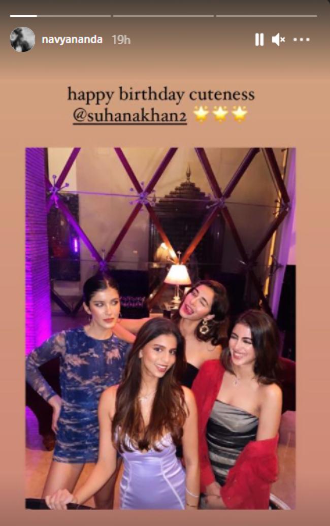 नव्या ने सुहाना को बर्थडे विश करते हुए इंस्टाग्राम स्टोरी पर एक तस्वीर शेयर की है, जिसमें अमिताभ बच्चन की नातिन नव्या, शाहरुख की बेटी सुहाना, अनन्या पांडे और शनाया कपूर पोज देती दिखाई दे रही हैं. सुहाना का गर्ल गैंग कैमरे की ओर पोज करता नजर आ रहा है. इस इमेज को शेयर करते हुए नव्या ने कैप्शन में लिखा, "हैप्पी बर्थडे क्यूटनेस" उनकी यह तस्वीर फैंस को बेहद पसंद आ रही है, वहीं उनके फैंस भी तस्वीर पर कमेंट करते हुए जन्मदिन की बधाइयां दे रहे हैं.