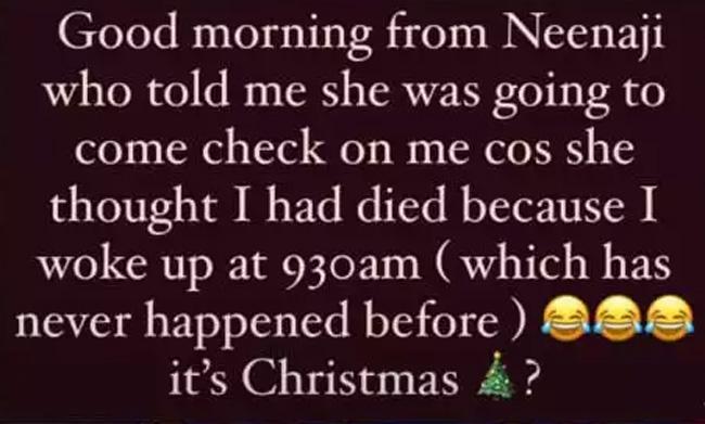 सोशल मीडिया पर मसाबा ने बताया है कि क्रिसमस की सुबह उनकी मां नीना गुप्ता को ऐसा लगा कि वे मर चुकी हैं. इस बारे में वे बताती हैं- नीनाजी ने बताया कि वे आकर चेक करने वाली थीं क्योंकि उन्हें लगा कि मैं मर गई हूं. उन्हें ऐसा इसलिए लगा क्योंकि उस दिन मैं सुबह 9.30 बजे उठी. ऐसा पहले कभी नहीं हुआ था. मसाबा का ये पोस्ट सोशल मीडिया पर वायरल हो चुका है. उनका ये पोस्ट एक तरफ सभी को हंसने पर मजबूर कर रहा है, वहीं कई ऐसे भी हैं जो इससे काफी रिलेट कर पा रहे हैं.