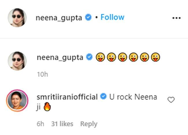 उनके इस वीडियो पर स्मृति ईरानी ने लिखा- 'U rock Neena ji'. स्मृति ने इसी के साथ एक फायर इमोजी भी डाला है. अब उनका ये कमेंट नीना के ड्रेसिंग के लिए हो चाहे नीना की बातों के लिए, दोनों में ही ये फिट बैठता है. स्मृति के अलावा बाकी सेलेब्स ने भी नीना गुप्ता के लुक को कॉम्प्लीमेंट किया है. रिया कपूर ने नीना गुप्ता के लुक की तारीफ करते हुए कहा- लुक बहुत बढ़िया है. मिथिला पालकर ने भी 'Fab!Fab!Fab' लिखकर नीना की प्रशंसा की है.