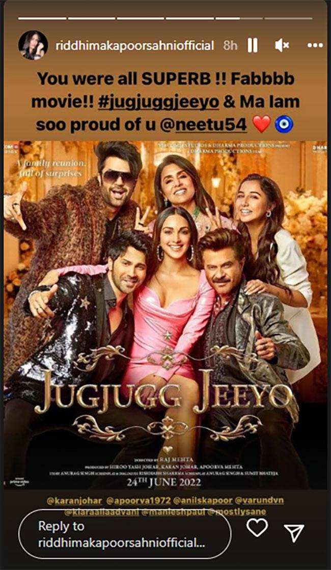 रिद्धिमा ने अपनी इंस्टाग्राम स्टोरी पर फिल्म जुग जुग जियो का पोस्टर शेयर करके लिखा- आप सभी SUPERB थे. फैब मूवी जुग जुग जियो. मां मुझे आप पर गर्व है. फिल्म में अपनी मां यानी नीतू कपूर की शानदार अदाकारी देखकर तो रिद्धिमा कपूर खुशी से फूली नहीं समा पा रही हैं. रिद्धिमा ने फिल्म की तारीफ करने के साथ अपनी मां पर भी प्यार लुटाया है.
