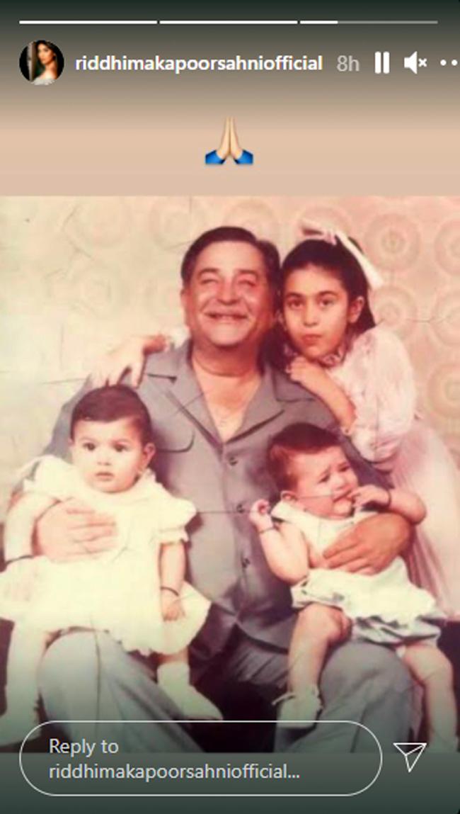 वीडियो को शेयर करते हुए एक्ट्रेस ने कैप्शन में लिखा, "मिस यू" नीतू कपूर के अलावा उनकी बेटी रिद्धिमा साहनी ने भी एक तस्वीर अपने इंस्टाग्राम स्टोरी पर शेयर की है, जिसमें राज कपूर के साथ करिश्मा कपूर, करीना कपूर खान और रिद्धिमा साहनी नजर आ रही हैं. उनके इस पोस्ट पर सभी कमेंटस कर उनको याद कर रहे हैं.