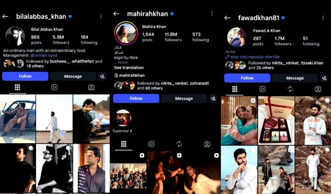 2025 के पहलगाम हमले के बाद पाकिस्तानी एक्टर्स के इंस्टाग्राम अकाउंट्स भारत में बैन हो गए थे. लेकिन हाल ही में माहिरा खान, हानिया आमिर, फवाद खान, बिलाल अब्बास खान, सजल अली जैसे स्टार्स के अकाउंट्स भारत में दिखाई दिए. थोड़ी देर बाद फिर से 'यह अकाउंट भारत में उपलब्ध नहीं है' का मैसेज आ गया.
