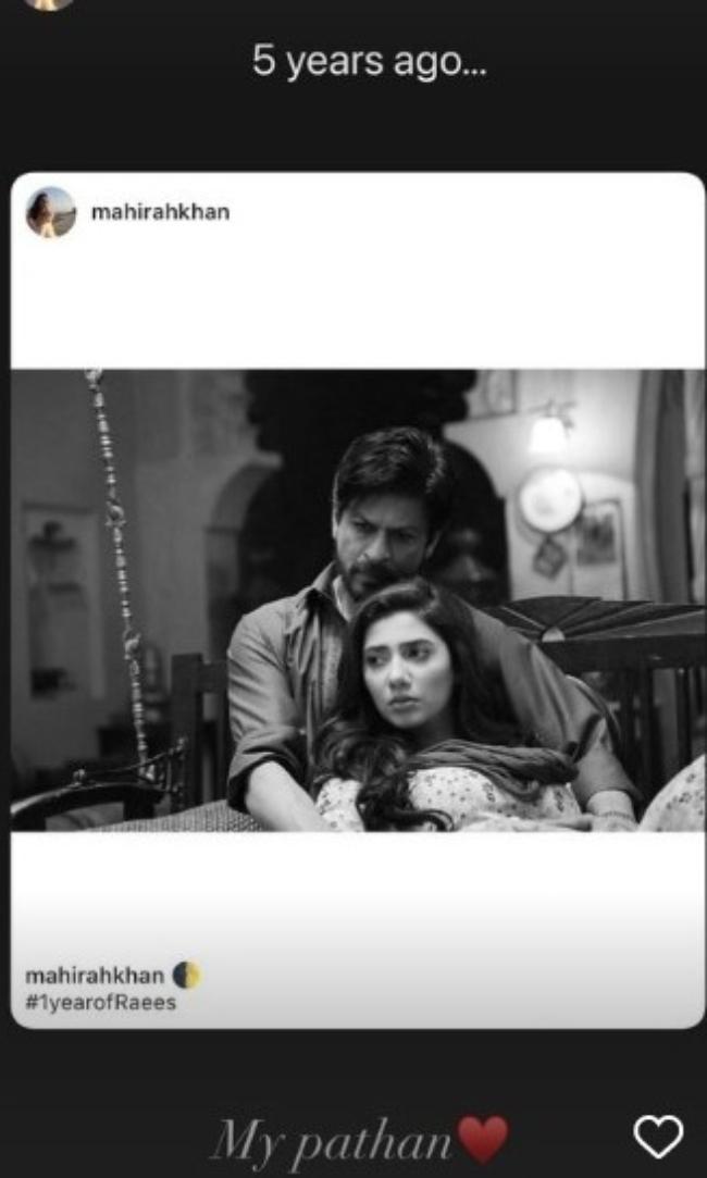 पाकिस्तानी एक्ट्रेस माहिरा खान ने शाहरुख खान के साथ अपनी फोटो शेयर कर 'पठान' के लिए अपना सपोर्ट दिखाया है. दोनों स्टार्स ने साथ में बॉलीवुड फिल्म 'रईस' में काम किया था. तब से दोनों के बीच अच्छी दोस्ती है. आज फिल्म 'रईस' को रिलीज हुए छह साल पूरे हो गए हैं. ऐसे में माहिरा ने शाहरुख संग अपनी फिल्म से एक फोटो को इंस्टा स्टोरी पर शेयर किया है. इसके साथ उन्होंने लिखा, 'मेरा पठान.'