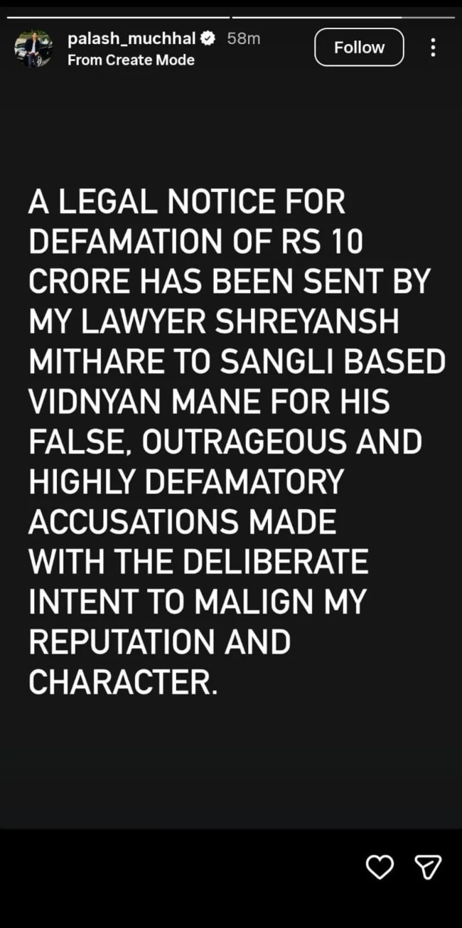 पलाश ने शनिवार, 24 जनवरी की शाम को अपने इंस्टाग्राम अकाउंट पर लिखा, 'मेरे वकील श्रेयांश मिथारे ने सांगली निवासी विद्यान माने को मेरी प्रतिष्ठा और चरित्र को जानबूझकर खराब करने के दुर्भावनापूर्ण इरादे से किए गए झूठे, असभ्य और अत्यधिक मानहानिकारक आरोपों के लिए 10 करोड़ रुपये की मानहानि का कानूनी नोटिस भेजा है.'