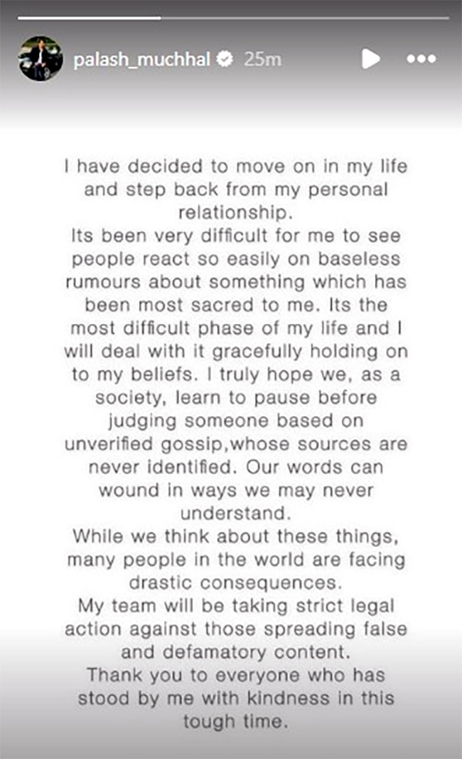 पलाश ने पोस्ट में लिखा- मैंने जिंदगी में आगे बढ़ने का फैसला लिया है. मैं अपने निजी रिश्तों से पीछे हट रहा हूं. मेरे लिए यह देखना काफी मुश्किल रहा है कि लोग मेरी पवित्र चीजों के बारे में बिना किसी आधार के इतनी आसानी से अपनी राय दे रहे है. यह मेरे जीवन का सबसे मुश्किल वक्त है और मैं अपनी मान्यताओं पर डटे रहते हुए इसे ग्रेसफुली हैंडल करूंगा.