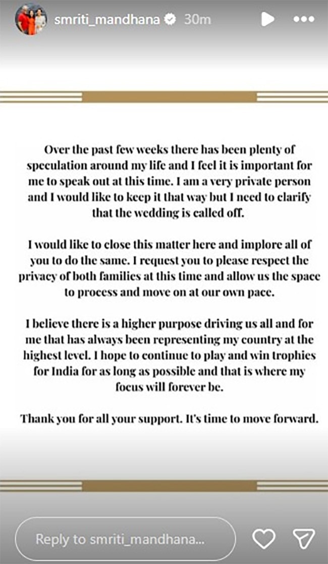 सिंगर पलाश और स्मृति लंबे वक्त से अपनी शादी पर चुप्पी साधे हुए थे. मगर अब पलाश ने अपनी इंस्टाग्राम स्टोरी पर पोस्ट शेयर करके ये साफ कर दिया है कि स्मृति संग उनकी शादी नहीं हो रही. उन्होंने कहा कि बीता कुछ वक्त उनके लिए बेहद मुश्किल रहा है. इसलिए अब वो लाइफ में पुराने रिश्तों से मूव ऑन करना चाहते हैं. पलाश ने उनपर आरोप लगाने वाले लोगों पर लीगल एक्शन लेने की बात कही है.