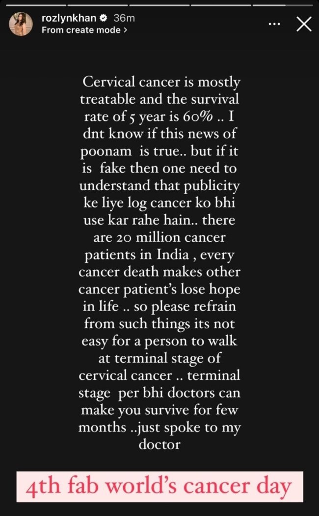 अपनी इंस्टा स्टोरी पर एक्ट्रेस रोजलिन खान ने लिखा, 'सर्वाइकल कैंसर का ज्यादातर इलाज ज्यादातर किया जा सकता है और इसका पिछले 5 सालों का सर्वाइवल रेट 60 प्रतिशत है. मुझे नहीं पता कि पूनम को लेकर आई ये खबर सच है या नहीं. लेकिन अगर ये झूठ है तो आपको समझने की जरूरत है कि पब्लिसिटी के लिए लोग कैंसर का भी इस्तेमाल कर रहे हैं.'