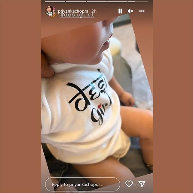 वहीं इस दफा इंस्टा स्टोरी में प्रियंका की परी का थोड़ा-थोड़ा चेहरा नजर आ रहा है. नोटिस करने वाली बात ये है कि एक्ट्रेस ने अपनी बेटी को 'देसी गर्ल' टैगलाइन वाली टी-शर्ट पहना रखी है. टैगलाइन के साथ व्हाइट टी-शर्ट मालती पर काफी सूट कर रही है. मालती की प्यारी की झलक देख कर शायद ही कोई होगा, जो उस पर से अपनी नजरें हटा पायेगा.