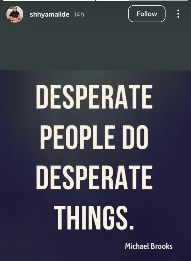 रविवार, 30 नवंबर को, समांथा और राज की शादी से एक दिन पहले भी श्यामली डे ने एक पोस्ट शेयर की थी. लेखिका-हीलर श्यामली ने अपनी इंस्टा स्टोरी पर लिखा था, 'Desperate people do desperate things.' जिसका मतलब है कि निराश लोग निराश करने वाले काम करते हैं). यह पोस्ट तेजी से वायरल हुई और लोग कयास लगाने लगे कि यह किसके लिए था.