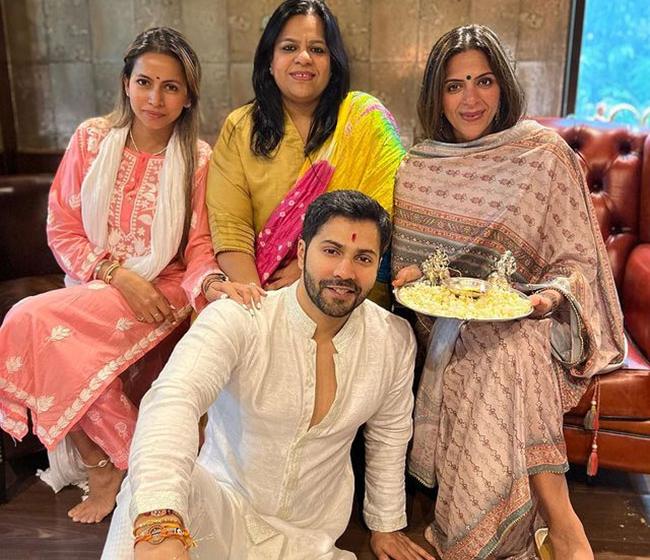 वरुण धवन की राखी की फोटोज फैंस के बीच बेहद पसंद की जा रही हैं. वरुण ने बहनों के साथ की तस्वीर पोस्ट की हैं. राखी के दिन वरुण ने सफेद रंग के कुर्ते पायजामे को चूज किया. इस लुक में वरुण एकदम डैशिंग लग रहे हैं.