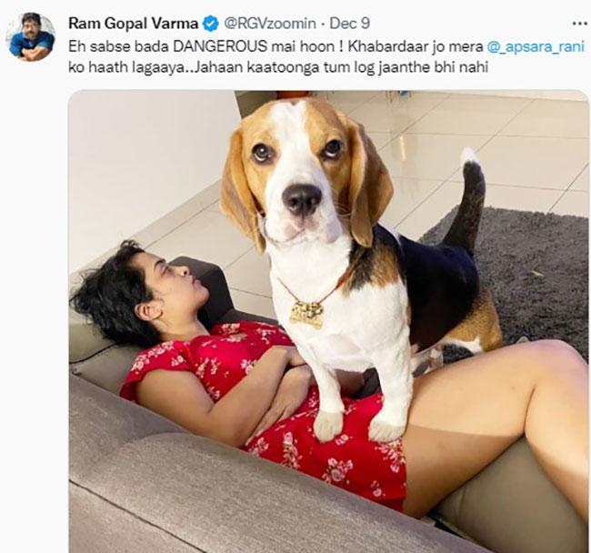 रामगोपाल ने अप्सरा की डॉगी संग तस्वीर और आशु रेड्डी के पैरों को चूमने वाली फोटो का कोलाज शेयर किया. फिर लिखा- आशू रेड्डी के पैरों पर बैठकर जो डेंजरस इमोशन मैंने फील किया वो मैंने अप्सरा रानी के डॉगी से सीखा. जो इंस्टा पर है. अप्सरा रानी के इस डॉगी का नाम हैरी महाराणा है. इंस्टा पर हैरी की अप्सरा संग कई तस्वीरें दिख जाएंगी.