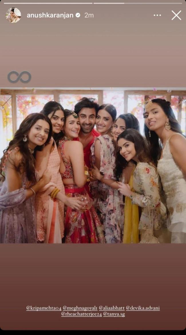अनुष्का रंजन द्वारा शेयर की गई फोटो में रणबीर कपूर पत्नी आलिया भट्ट और उनकी दोस्तों के साथ खड़े नजर आ रहे हैं. आलिया की कई दोस्त उनकी शादी में शामिल हुई थीं. ऐसे में सभी ने जीजा जी रणबीर कपूर के साथ फोटो के लिए पोज दिया. वैसे ये फोटो आलिया और रणबीर की मेहंदी सेरेमनी की है. इसमें सभी कैमरा के लिए स्माइल करते नजर आ रहे हैं.