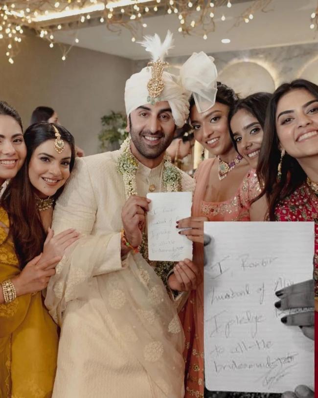 शादी से आई लेटेस्ट फोटो में रणबीर कपूर को सालियों के साथ खड़े हुए देखा जा सकता है. इस फोटो में मुस्कुराते रणबीर के हाथ में एक पेपर भी है. इस पेपर पर रणबीर कपूर ने लिखा हुआ है, 'मैं, रणबीर, आलिया का पति वादा करता हूं कि उनकी सभी सहेलियों को 12 लाख रुपये दूंगा.' लगता है कई इस पेपर के साथ रणबीर की फोटो लेकर आलिया की दोस्तों ने डील को पक्का किया है. साथ ही यह फोटो सबूत के तौर पर ली गई है, ताकि रणबीर अपनी बात से मुकरे ना. वैसे एक्टर भी सालियों के बीच सही फंस गए हैं.