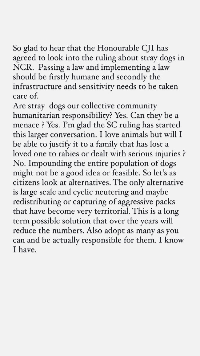 उन्होंने यह भी लिखा कि सारे आवारा कुत्तों को पकड़कर बंद कर देना न तो व्यावहारिक है और न ही असरदार. इसके बजाय उन्होंने लंबे समय के लिए टिकाऊ कदम सुझाए. जैसे बड़े स्तर पर और नियमित रूप से नसबंदी करना, आक्रामक झुंडों को पकड़कर अलग-अलग जगहों पर पुनर्वितरित करना और जिम्मेदार अडॉप्ट करने वालों को बढ़ावा देना. उन्होंने लिखा, 'ये एक ऐसा समाधान है जो समय के साथ उनकी संख्या को कम करेगा. साथ ही जितने हो सके उतने को अपनाएं और उनकी पूरी जिम्मेदारी लें. मैं खुद ऐसा करता हूं.'