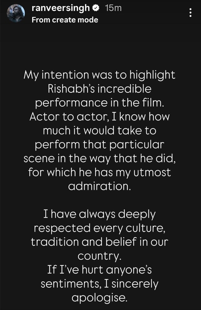 इंटरनेशनल फिल्म फेस्टिवल ऑफ इंडिया में 'कांतारा' की 'चामुंडा देवी' की नकल उतरने के लिए रणवीर सिंह के खिलाफ कानूनी कार्रवाई की मांग की जा रही है. विवाद बढ़ने पर रणवीर सिंह ने इंस्टाग्राम स्टोरी शेयर कर माफी मांगी है. उन्होंने लिखा कि मैं फिल्म में ऋषभ शेट्टी की जबरदस्त परफॉर्मेंस की तारीफ कर रहा था. एक एक्टर ही समझ सकता है कि फिल्म में इस तरह की परफॉर्मेंस देने के लिए कितनी मेहनत लगती है, जैसे कि उन्होंने की. उन्होंने उस सीन को जिस तरह निभाया, वो काबिले-ए-तारीफ है.