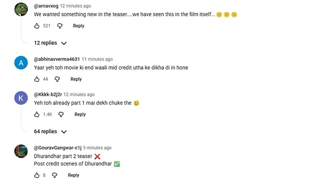 सोशल मीडिया पर टीजर को ट्रोल करते हुए एक यूजर ने लिखा- चूना लगा दिया. किसी ने लिखा- हम टीजर में कुछ नया चाहते थे. ये सीन और सीक्वेंस तो हम फिल्म में देख चुके हैं. दूसरे ने लिखा- ये तो मूवी के एंड वाला मिड क्रेडिट उठाकर दिखा दिया गया है. शख्स ने कहा- ये तो हम पार्ट 1 में देख चुके थे. फिर से यही क्यों दिखा दिया. यूजर का कहना है इसे धुरंधर का पार्ट 2 टीजर नहीं बल्कि धुरंधर के पोस्ट क्रेडिट सीन्स कहना चाहिए. आदित्य धर से यूजर्स पूछ रहे हैं कि क्यों आदित्य ने फैंस के साथ ऐसा गंदा प्रैंक किया है.