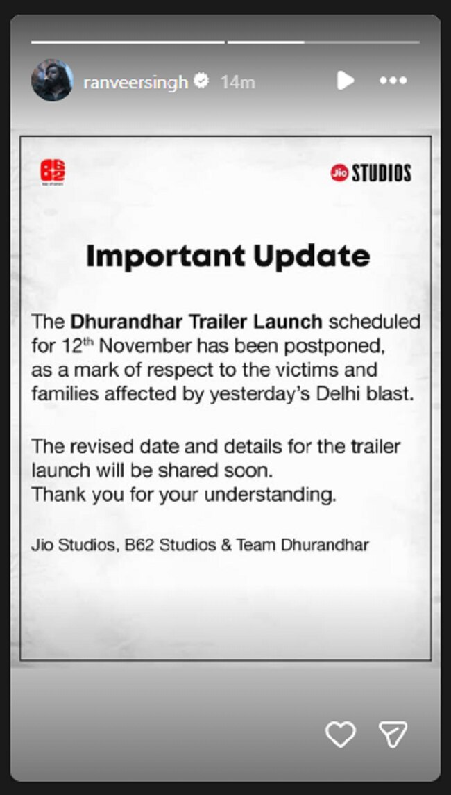 रणवीर सिंह की फिल्म 'धुरंधर' का इंतजार फैंस बेसब्री से कर रहे हैं. इस पिक्चर का ट्रेलर बुधवार, 12 नवंबर 2025 को मुंबई में होने वाला था. मेकर्स ने एक भव्य इवेंट का प्लान बनाया था. लेकिन अब ये प्लान चौपट हो गया है. रिपोर्ट आ रही थी कि दिल्ली में हुए बम ब्लास्ट को देखते हुए 'धुरंधर' के मेकर्स ट्रेलर लॉन्च को पोस्टपोन कर सकते हैं. अब वही हुआ है.