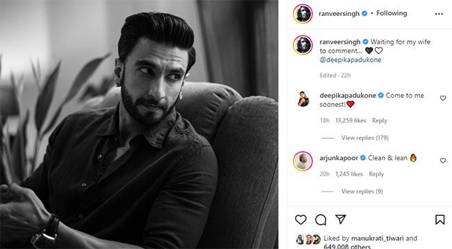रणवीर ने इंस्टाग्राम पर अपनी एक नई फोटो शेयर की. ब्लैक एंड वाइट फोटो में रणवीर के एक चेयर पर बैठे हैं और पीछे की तरफ बहुत उत्सुकता से देख रहे हैं. इस तरह मानो किसी का इन्तजार कर रहे हों. फोटो में उनका लुक बहुत जबरदस्त लग रहा है और ब्लैक शर्ट में बाल पीछे को किए हुए वो बहुत डैशिंग लग रहे हैं. पोस्ट को फोटो के साथ जमता हुआ एक कैप्शन देते हुए रणवीर ने लिखा, "मेरी पत्नी के कमेंट का इंतजार करते हुए." उन्होंने साथ में दीपिका को टैग भी किया.