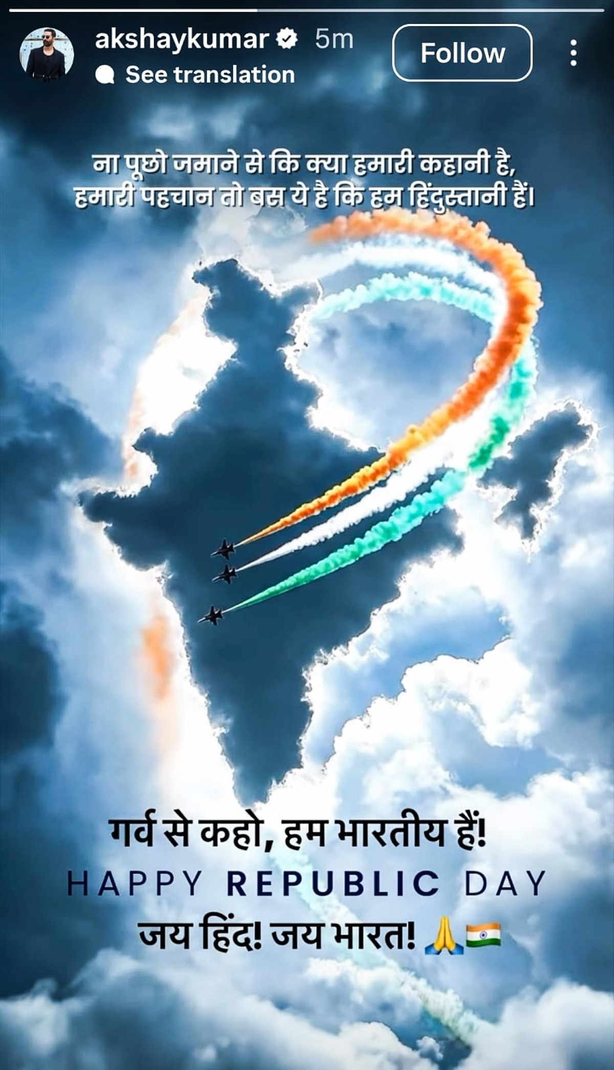 वहीं बॉलीवुड के खिलाड़ी यानी अक्षय कुमार ने अपनी इंस्टाग्राम स्टोरी पर भारतीय झंडे के वीडियो के साथ गणतंत्र दिवस का एक दिल छू लेने वाला मैसेज शेयर किया. एक्टर ने लिखा, 'ना पूछो जमाने से कि क्या हमारी कहानी है, हमारी पहचान तो बस ये है कि हम हिंदुस्तानी हैं. गर्व से कहो हम भारतीय हैं...'