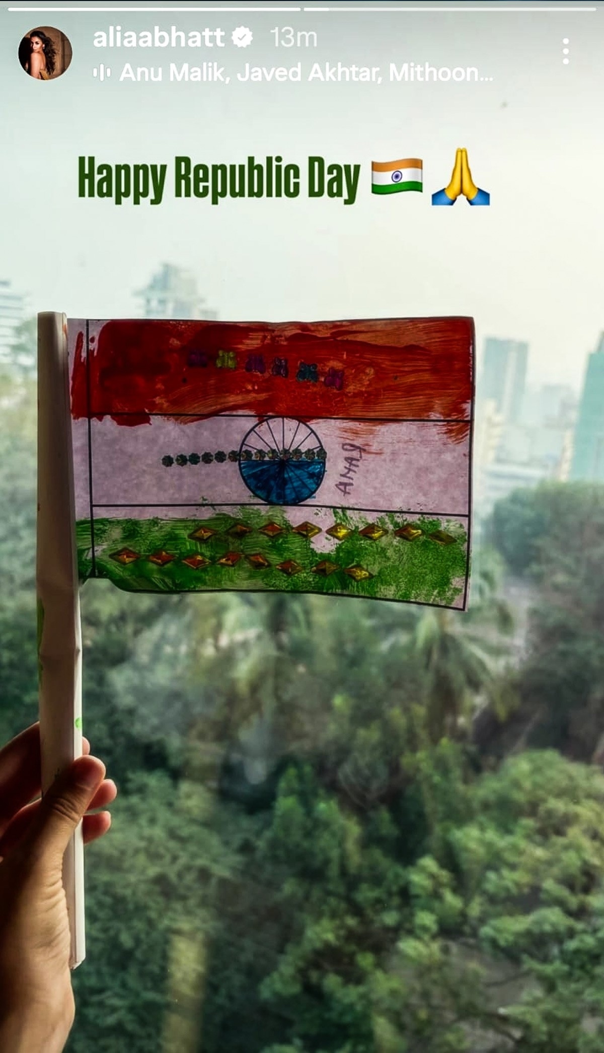 बॉलीवुड की सबसे हसीन एक्ट्रेस आलिया भट्ट ने गणतंत्र दिवस के मौके पर अपने इंस्टाग्राम स्टोरी पर हमारे राष्ट्रीय ध्वज के साथ एक फोटो शेयर की. फोटो में देखा जा सकता है कि भारतीय झंडा हाथ से बना हुआ लग रहा है, साथ ही उसपर 'राहा' का जिक्र है. यानी ऐसा लग रहा है आलिया-रणबीर की बेटी ने ही इसे बनाया है.