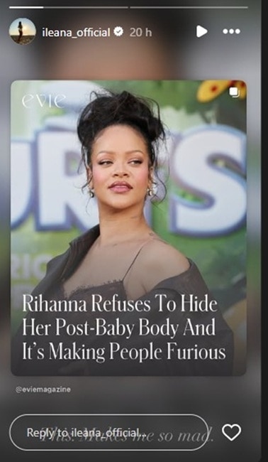 इलियाना ने इंस्टाग्राम पर एक पोस्ट शेयर किया, जिसमें बताया गया कि क्रिटिसिज्म के बाद रिहाना ने अपनी पोस्ट-प्रेग्नेंसी बॉडी छिपाने से इनकार किया और इससे लोग नाराज हो गए. इस पर रिएक्ट करते हुए इलियाना ने लिखा- ये मुझे बहुत गुस्सा दिलाता है.