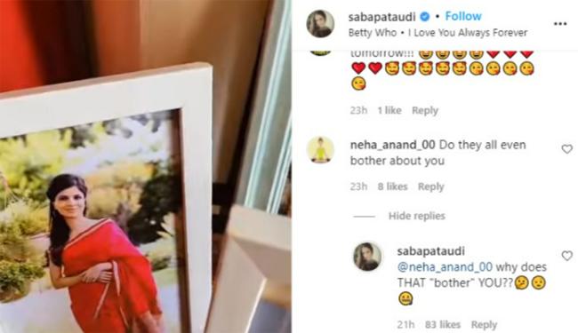 यूजर ने लिखा, क्या ये सब आपकी भी परवाह करते हैं? इसका जवाब देते हुए सबा ने फौरन लिखा कि ये बात आपको क्यों परेशान कर रही है? अपने इस कमेंट में सबा अली खान ने थिंकिंग, raised eyebrow और zipper-mouth face इमोजी बनाया था. सबा की इस पोस्ट पर कई यूजर ने जवाब देते हुए बताया कि इनाया चार साल की होने वाली है. मालूम हो 29 सितंबर को इनाया का जन्मदिन है.