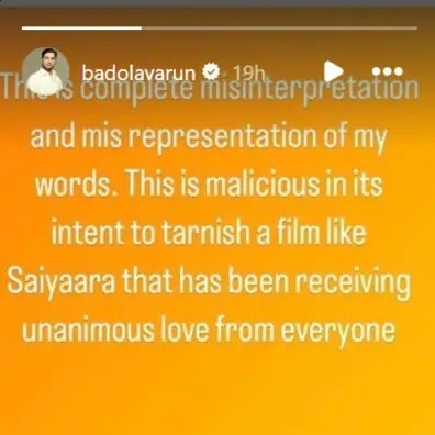 मगर अब वरुण ने इंस्टाग्राम पर एक स्टोरी पोस्ट करके अपनी सफाई में कहा हैं कि उनकी बातों का गलत मतलब निकाला गया. एक्टर ने लिखा है, 'मेरे शब्दों को पूरी तरह से गलत समझा गया और इन्हें गलत तरीके से प्रस्तुत किया गया है. इसका इरादा सैयारा फिल्म की छवि को नुकसान पहुंचाने का है, जो सभी की ओर से काफी सारा प्यार बटोर रही है.'