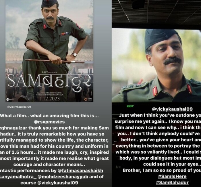 एक लंबा चौड़ा पोस्ट कर सनी कौशल ने सैम बहादुर को सबसे अमेजिंग फिल्म बताया, वहीं अपने भाई विक्की की तारीफों के पुल बांधे. सनी ने लिखा- क्या तो फिल्म है ये, बेहद ही अमेजिंग और जबरदस्त. थैंक्यू मेघना गुलजार, सैम बहादुर फिल्म बनाने के लिए. ये कहने लायक बात है कि आपने कितनी खूबसूरती से जिंदगी, कैरेक्टर, उस आदमी का प्यार जो उसे इस देश से रहा, पूरा यूनिफॉर्म, महज ढाई घंटों में समेटने में कामयाब रहे हो. इस फिल्म ने मुझे रुलाया है, हंसाया है, इंस्पायर किया है. सबसे महत्वपूर्ण बात की इस फिल्म से मैंने सीखा कि करेज और कैरेक्टर का मतलब क्या होता है.