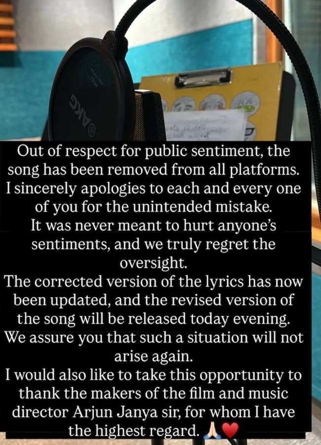 उन्होंने स्वीकार किया कि लोगों की भावनाएं आहत हुई हैं और गायक के तौर पर वह इसका सम्मान करती हैं. मंगली ने भरोसा दिलाया है कि इस गाने के विवादित हिस्से को सुधार लिया गया है और इसका नया वर्जन जल्द ही दर्शकों के सामने होगा. वहीं बता दें कि गाने के सभी वर्जनन – हिंदी, कन्नड़, मलयालम, तमिल और तेलुगु – अब हटा दिए गए हैं.