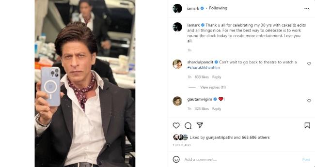 अपने पोस्ट में शाहरुख खान ने लिखा, 'मेरे इंडस्ट्री में 30 साल पूरे होने का जश्न केक और एडिट की फोटोज और अच्छी-अच्छी चीजों के साथ मनाने के लिए सभी का शुक्रिया. मेरे लिए सेलिब्रेट करने का बेस्ट तरीका आज पूरा दिन काम करने और एंटरटेनमेंट बनाना है. सभी को प्यार.' वहीं कई यूजर्स का कहना है कि यह उनका डॉन 3 का लुक हो सकता है.