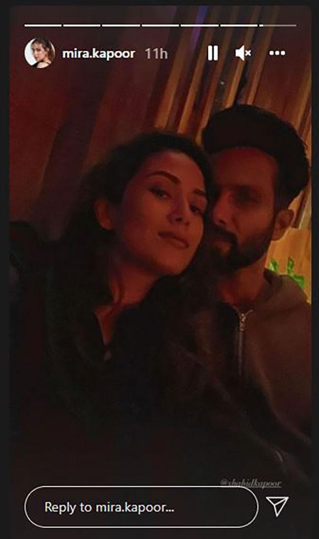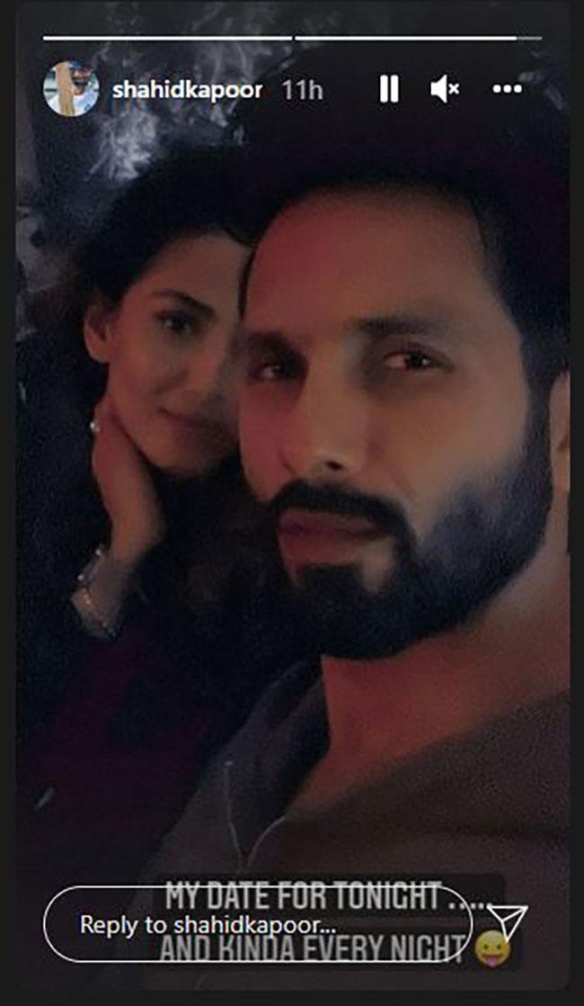 मीरा और शाहिद ने अपनी सोशल मीडियो स्टोरीज के जरिए फैंस को अपनी डेट नाइट की झलक दिखाई है. कपल ने एक दूसरे संग अपनी-अपनी इंस्टाग्राम स्टोरी पर रोमांटिक इवनिंग की फोटो शेयर की है. फोटो में दोनों एक दूसरे के साथ क्वालिटी टाइम स्पेंड करते हुए नजर आ रहे हैं. शाहिद ने फोटो शेयर करते हुए कैप्शन लिखा- मेरी डेट आज रात के लिए.....और हर रात के लिए.