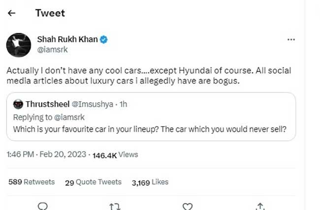 इस पर किंग खान बताते हैं, 'वास्तव में मेरे पास कोई कूल कारें नहीं हैं, Hyundai को छोड़कर. सोशल मीडिया पर मेरी लग्जरी कारों के बारे में जितने आर्टिकल्स लिखे जाते हैं, वो गलत हैं.'