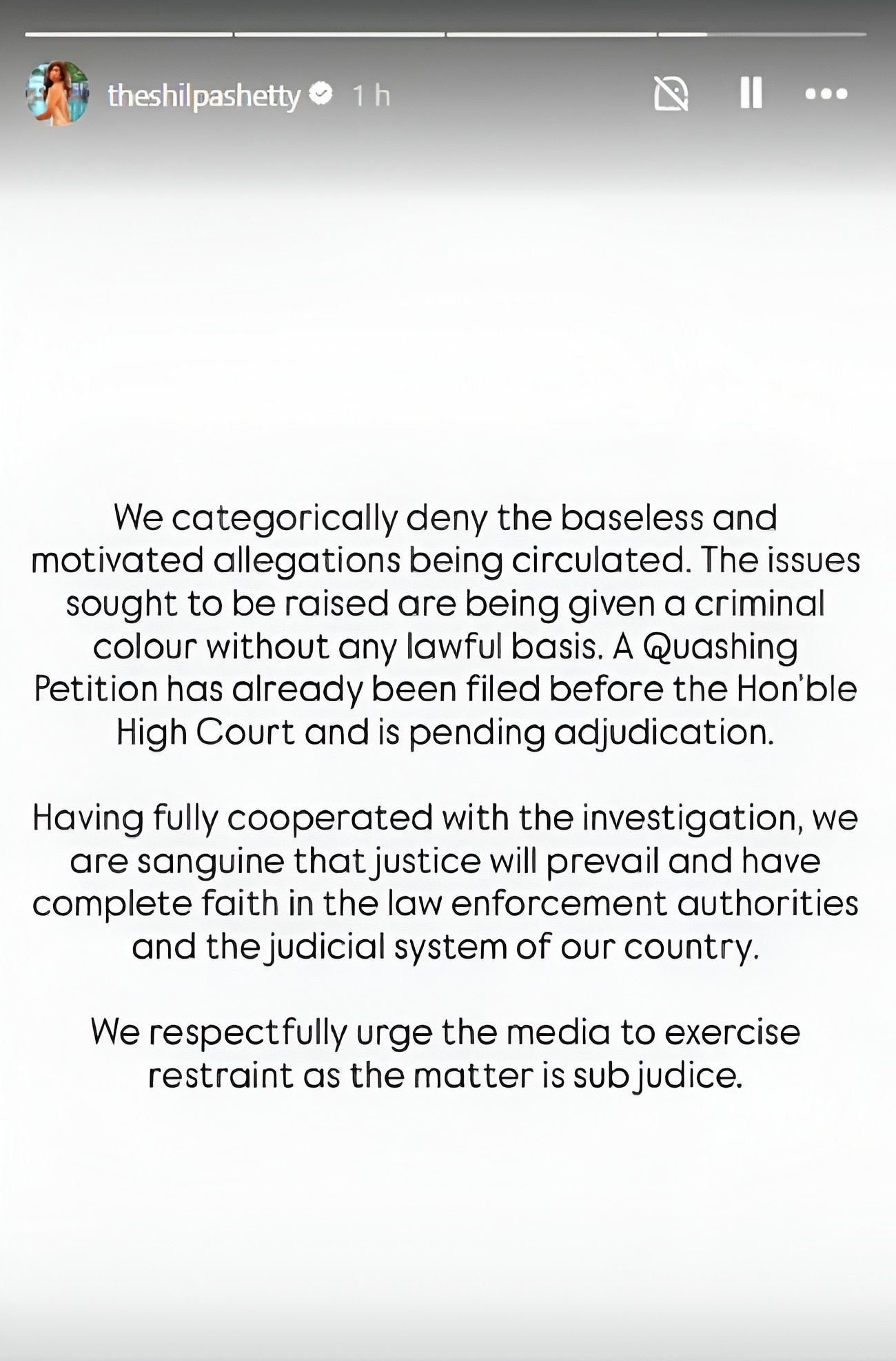 अपनी इंस्टाग्राम स्टोरी पर शिल्पा शेट्टी ने लिखा, 'हम प्रसारित की जा रही निराधार और प्रेरित आरोपों को स्पष्ट रूप से अस्वीकार करते हैं. जिन मुद्दों को उठाया जा रहा है, उन्हें बिना किसी कानूनी आधार के आपराधिक रंग दिया जा रहा है. माननीय उच्च न्यायालय के समक्ष पहले ही मामला रद्द करने की याचिका दाखिल की जा चुकी है और वह विचाराधीन है.'