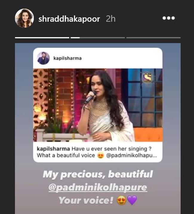 श्रद्धा कपूर ने पद्मिनी कोल्हापुरी के गाना गाते हुए वीडियो को अपनी इंस्टा स्टोरी पर शेयर किया है. उन्होंने वीडियो शेयर करते हुए लिखा-My precious, beautiful पद्मिनी कोल्हापुरी. आपकी आवाज!