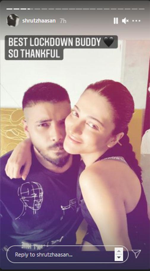 श्रुति ने ये फोटो अपने इंस्टाग्राम स्टोरी पर शेयर की है, जिसमें उन्होंने बॉयफ्रेंड शांतनु के गले में हाथ डाला हुआ है और वह कैमरे को देखकर स्माइल कर रही हैं. फोटो को शेयर करते हुए एक्ट्रेस ने लिखा, 'बेस्ट लॉकडाउन बडी, मैं आभारी हूं." पिक्चर में देखा जा सकता है दोनों ने ब्लैक कलर की टी-शर्ट पहनी हुई है. श्रुति हासन अक्सर अपने बॉयफ्रेंड शांतनु हजारिका के साथ तस्वीरें सोशल मीडिया पर शेयर करती है, जो कि बड़ी तेजी से वायरल होती है. उनकी ये तस्वीर भी फैंस का जमकर प्यार बटोर रही है.