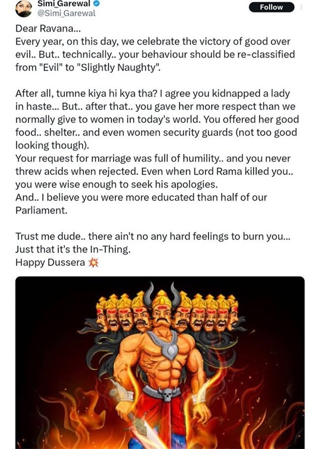 दरअसल एक्ट्रेस सिमी ग्रेवाल ने सोशल मीडिया X पर दशहरा की बधाई देते हुए कहा, 'डियर रावण... हर साल, इस दिन, हम बुराई पर अच्छाई की जीत का उत्सव मनाते हैं. हालांकि तकनीकी रूप से, आपके व्यवहार को बुराई से अलग थोड़ा शरारती के रूप में माना जाना चाहिए. आखिर तुमने किया ही क्या था? मैं मानती हूं कि तुमने जल्दबाजी में एक महिला का अपहरण कर लिया लेकिन उसके बाद तुमने उसे ज्यादा सम्मान दिया, जितना हम आज की दुनिया में महिलाओं को देते हैं. तुमने उसे अच्छा खाना दिया. रहने की जगह दी और यहां तक कि महिला सुरक्षा गार्ड भी दिया.'