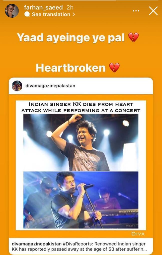 पाकिस्तानी एक्टर और सिंगर फरहान सईद ने भी केके के निधन पर शोक जताया है. फरहान ने लिखा कि उनका दिल टूट गया है.