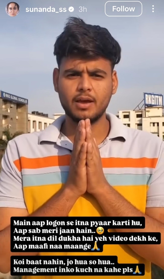 वहीं स्टेज पर चढ़ने वाले छात्र द्वारा भी वीडियो जारी कर सुनंदा शर्मा से माफी मांगी. उसका कहना है कि वह सुनंदा शर्मा का फैन हैं और इसलिए वह उनके पैर छूना चाहता था. वह घटना के लिए गलती मानते हुए माफी मांगता है.