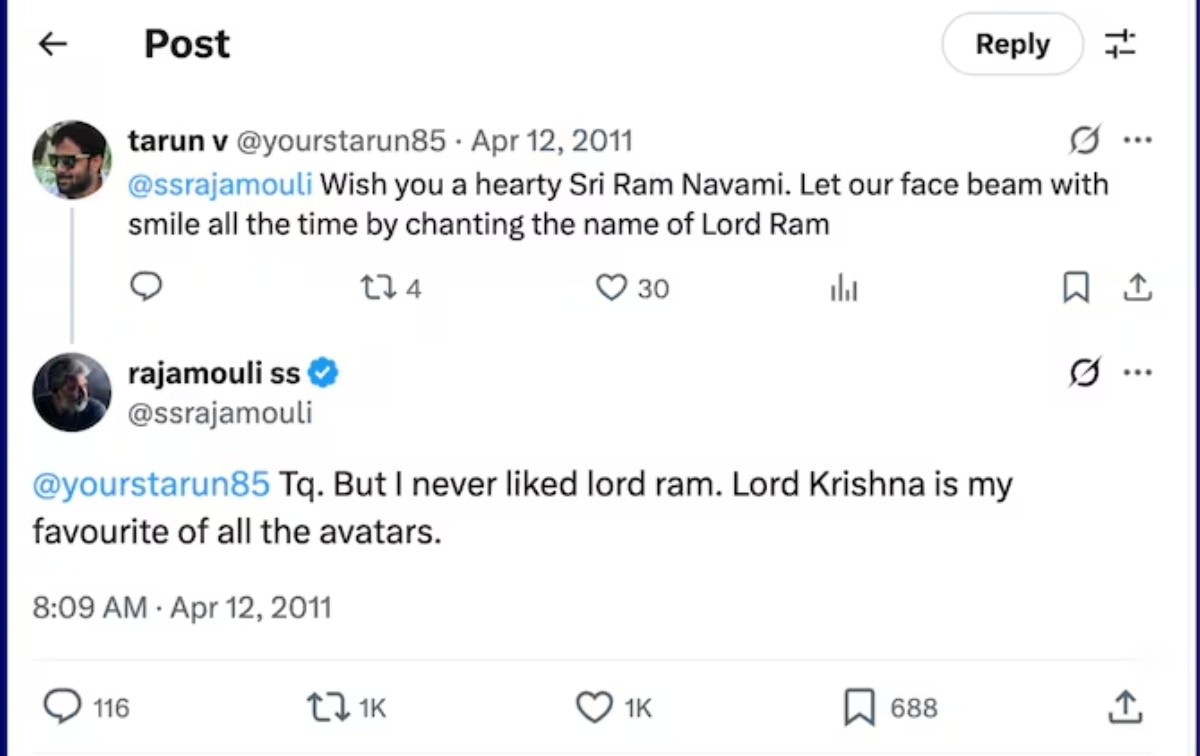 एक फैन के राम नवमी विश करने पर राजामौली ने अपने उस ट्वीट (अब X)में लिखा था- "लेकिन मुझे कभी भगवान राम पसंद नहीं आए. भगवान कृष्ण हमेशा से मेरे पसंदीदा अवतार रहे हैं.''