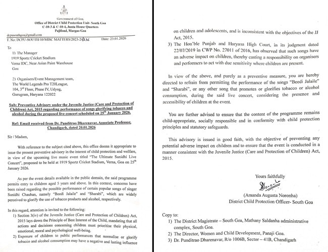 दरअसल 'द अल्टीमेट सुनिधि लाइव' कॉन्सर्ट का आयोजन 25 जनवरी 2026 को गोवा के वर्ना स्थित 1919 स्पोर्ट्ज़ क्रिकेट स्टेडियम में होने जा रहा है. इस शो की खास बात यह है कि इसमें पांच साल और उससे अधिक उम्र के बच्चों को भी एंट्री दी गई है. यही वजह है कि प्रशासन की चिंता बढ़ गई है, क्योंकि बच्चों की मौजूदगी में गानों का चुनाव बहुत सोच-समझकर किया जाना जरूरी है.