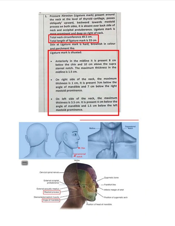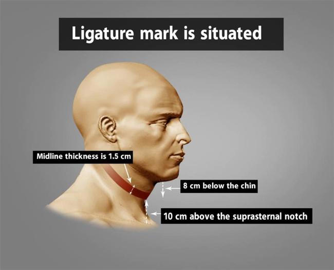 मेनन ने जोर देकर कहा कि फंदा खुदकुशी है या हत्या, ये आगे जांच का विषय है. उन्होंने कहा, लेकिन उपलब्ध एग्जिबिट्स, गर्दन के चित्र और प्रोविजनल ऑटोप्सी रिपोर्ट से यही साबित होता है कि फंदा लगाया गया जैसा कि V के आकार के खांचे से भी संकेत मिलता है. इस निशान की परिधि 49.5 सेंटीमीटर की गर्दन पर 33 सेंटीमीटर है."