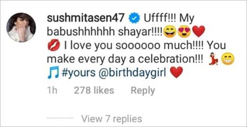 फोटो शेयर करते हुए रोहमन ने लिखा, 'कुछ न कहूं तो अधूरा सा रह जाएगा. कुछ कहूं तो भी पूरा ना हो पाएगा. तू बेमिसाल है, ये दुनिया ने माना है. तू क्या कमाल है, ये मैंने तेरे पास आके जाना है.' रोहमन ने आगे लिखा, 'हैप्पी हैप्पी वाला बर्थडे मेरी बाबुश.' रोहन के इस पोस्ट पर सुष्मिता ने कमेंट किया, 'मेरे बाबुश शायर. आई लव यू सो मच. तुम हर दिन को सेलिब्रेशन बना देते हो.'