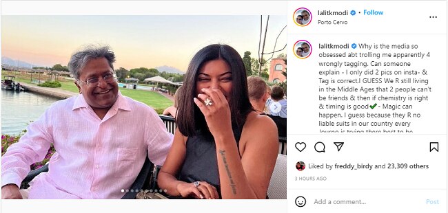 अपने इस पोस्ट में ललित मोदी ने मीडिया और ट्रोल्स को लताड़ा है. उनका कहना है कि उन्होंने सुष्मिता सेन के सही अकाउंट को टैग किया था, इसमें ट्रोल करने वाली कोई बात नहीं थी. ललित का कहना है कि उन्हें समझ नहीं आता कि लोग उन्हें ट्रोल करने के लिए इतने उत्सुक क्यों रहते हैं. उन्होंने लिखा कि मुझे लगता है कि हम आज भी पुराने जमाने में रह रहे हैं कि दो लोग दोस्त नहीं हो सकते, और अगर उनके बीच केमिस्ट्री है और समय सही है तो जादू हो सकता है. मेरी आप लोगों को सलाह है कि जियो और जीने दो.