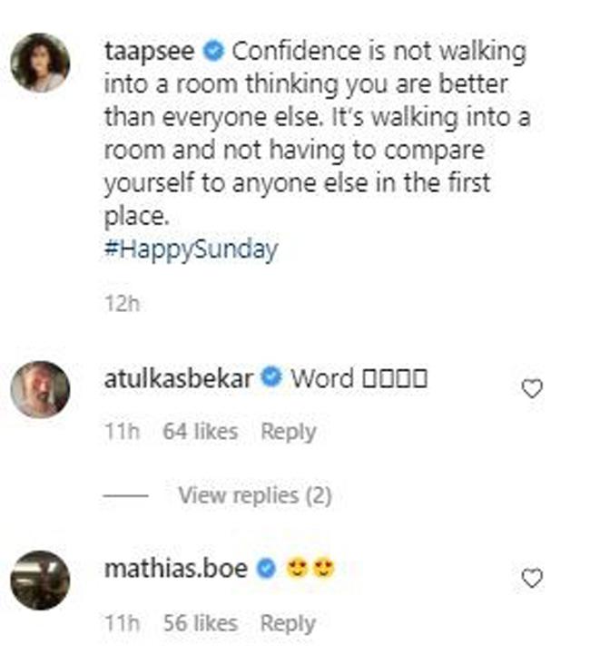 तापसी ने कॉन्फिडेंस के बारे में बात करते हुए एक दिलचस्प पोस्ट की. हालांकि सभी का ध्यान उनके बॉयफ्रेंड Mathias Boe के कमेंट ने खींचा. तापसी पन्नू ने अपने इंस्टाग्राम अकाउंट पर फोटो शेयर करते हुए लिखा, 'कॉन्फिडेंस का मतलब यह नहीं कि आप यह सोचकर एक कमरे में घुसें कि आप हर किसी से बेहतर हैं. इसका मतलब है कि आप कभी भी किसी कमरे में घुसें तो लोगों से खुद की तुलना न करें.