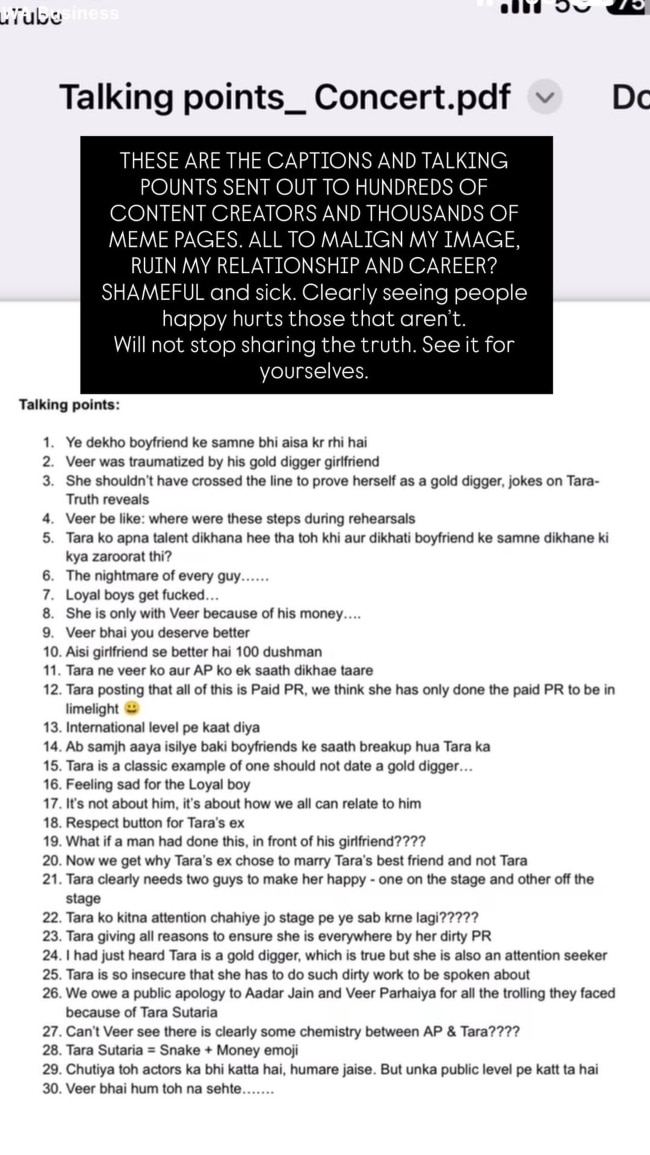 एक्ट्रेस ने एक इन्फ्लुएंसर के पोस्ट को भी री-शेयर किया. पोस्ट में इन्फ्लुएंसर ने दावा किया कि उसे भी एक पीआर कंपनी से इन्हीं टॉकिंग पॉइंट्स की लिस्ट मिली थी. साथ ही इन पॉइंट्स पर आधारित कंटेंट बनाने के बदले 6,000 रुपये ऑफर की गए थे. तारा हाल ही में एपी ढिल्लों के पुणे कॉन्सर्ट में नजर आई थीं. यहां उनके बॉयफ्रेंड वीर पहाड़िया भी मौजूद थे. तारा और ढिल्लों को स्टेज पर 'किस' करते देखा गया. इसके बाद अफवाहें फैलने लगीं कि वीर दोनों को साथ देखकर असहज हो गए थे. वायरल वीडियो के चलते तारा को ट्रोल करने वालों की बाढ़-सी आ गई. एक्ट्रेस एक कैरेक्टर पर सवाल उठाए गए. यहां तक कि उनके आदर जैन संग रिलेशनशिप को भी घसीटा गया.