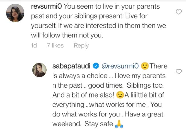 कुछ ने तो सबा अली खान को ट्रोल भी कर दिया. एक यूजर ने सबा के फोटो पर कमेंट किया, 'ऐसा लगता है कि आप अपने माता-पिता के अतीत और भाई-बहनों के वर्तमान में जीती हैं. अपने लिए जियो. अगर हम उनमें दिलचस्पी रखते हैं तो उन्हें फॉलो करेंगे, आपको नहीं.'
