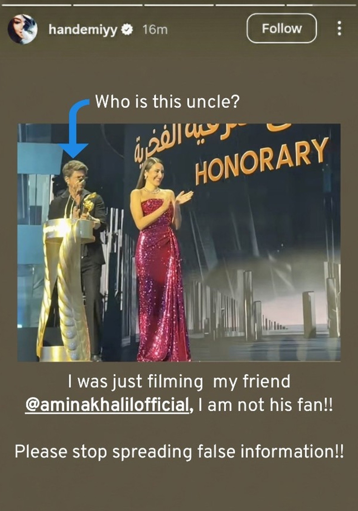 वायरल वीडियो में शाहरुख खान के साथ मिस्र की हसीना अमीना खलील स्टेज पर थीं. ये नजारा Hande Erçel कैप्चर कर रही थीं. लेकिन सच ये है कि वो शाहरुख खान को नहीं बल्कि अपनी दोस्त अमीना खलील को कैप्चर कर रही थीं. एक्ट्रेस ने इंस्टा स्टोरी पर शाहरुख और अमीना की ऑनस्टेज फोटो शेयर कर किंग खान को मेंशन करते हुए लिखा- कौन है ये अंकल?