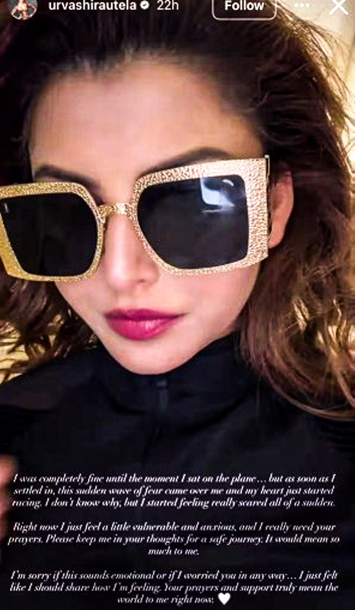 अपनी फीलिंग्स को बयां करते हुए उर्वशी ने पोस्ट में लिखा- प्लेन में बैठने तक तो मैं बिल्कुल ठीक थी, लेकिन जैसे ही मैं सेटल हुई, अचानक मुझे डर लगने लगा, घबराहट होने लगी और मेरा दिल जोर से धड़कने लगा. पता नहीं क्यों, लेकिन अचानक से मुझे बहुत डर लगने लगा था.